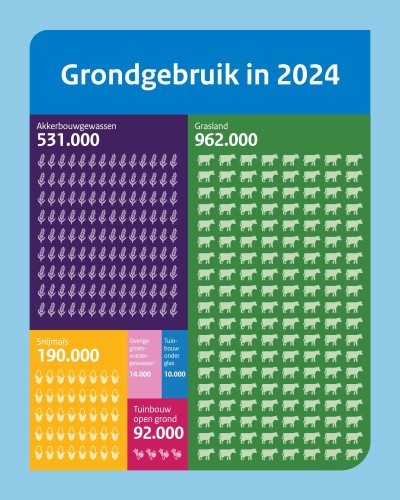 |  |  |  |     |  | Nederland voor 54% in gebruik als landbouw Meer dan de helft van Nederland bestaat uit landbouwgrond. In 2024 werd 54% van het landoppervlak, namelijk ruim 1,8 miljoen hectare, gebruikt voor landbouw. Daarvan is grasland het grootste onderdeel (962.000 hectare), gevolgd door akkerbouwgewassen (531.000 hectare) en snijmaïs (190.000 hectare). Deze verdeling is te zien in een nieuwe grafiek uit het Blauwe Boekje 2025. Dit boekje bevat veel meer interessante cijfers en grafieken over Nederland.